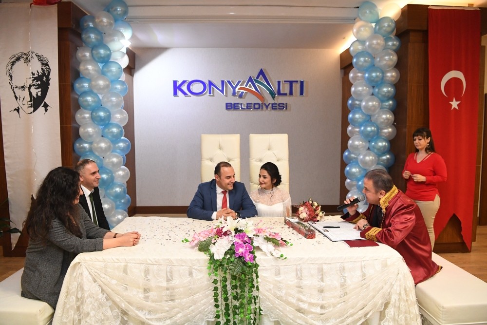 Konyaaltı Belediyesi, 14 Şubat Sevgililer Günü evlenmek için müracaatta bulunan çiftlere sürpriz hazırladı. Konyaaltı Belediye Başkanı Muhittin Böcek’in talimatıyla nikah akdinin gerçekleştirildiği Konyaaltı Belediyesi Feslikan Salonu balonlarla süslendi. Balonlardan oluşan kalplerin altında bol bol fotoğraf çekinen genç çiftler özel günlerini ölümsüzleştirmeyi de unutmadı. Konyaaltı Belediye Başkanı Böcek de 14 Şubat Sevgililer Gününü nikah tarihi olarak tercih eden çiftlerin nikahlarını kıydı.