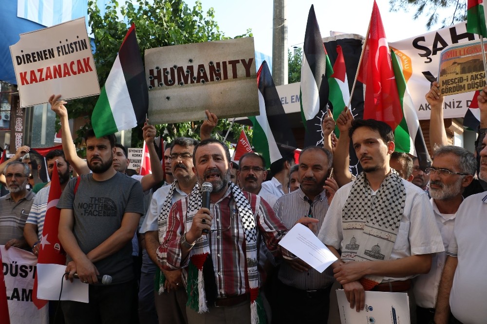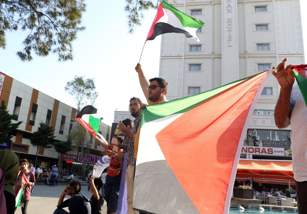 ‘Katil İsrail’, ’Filistin’e özgürlük’, ’Mescid-i Aksa’ya uzanan eller kırılsın’, ’Direnen Filistin kazanacak’ şeklinde sloganlar atan eylemciler, daha sonra sessizce dağıldı.