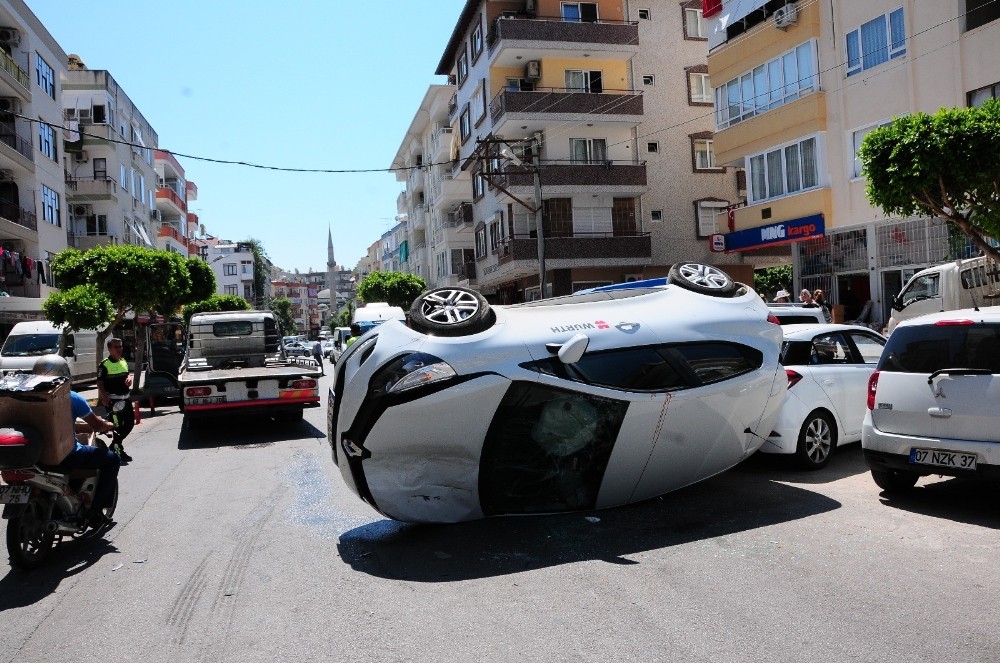 Antalya’nın Alanya ilçesinde otomobil sürücüsü iddiaya göre direksiyon başında cep telefonuyla mesajlaşırken park halindeki araca çarptı. Çarpmanın şiddetiyle takla atan araçta sürücü ağır yaralanırken, park halindeki 2 otomobil de zarar gördü.