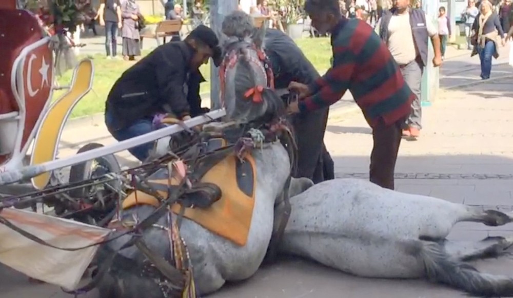 ANTALYA’DA FAYTONA BAĞLI İKİ AT TRAMVAY YOLU ÜZERİNDE DÖNERKEN KAYARAK YERE DEVRİLDİ. UZUN SURE YERDE…