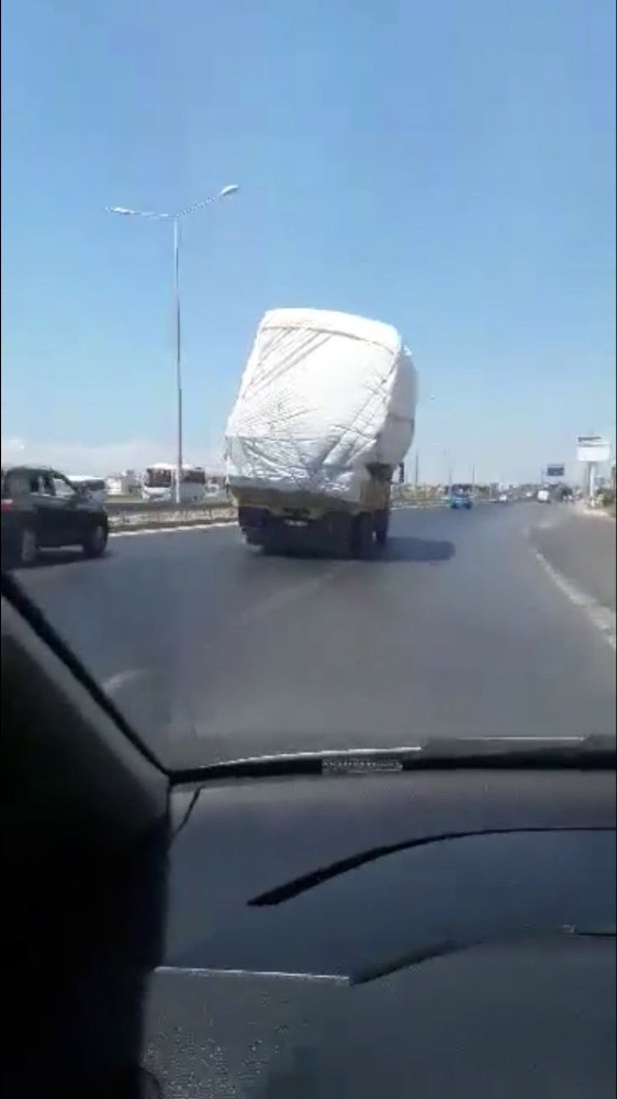 MANAVGAT-ANTALYA KARAYOLU’NDA ÜZERİ BEYAZ BRANDAYLA KAPLI YÜKLÜ KAMYONUN ÜZERİNDEKİ YÜK SEBEBİYLE NEREDEYSE YAN YATARAK İLERLEMESİ…