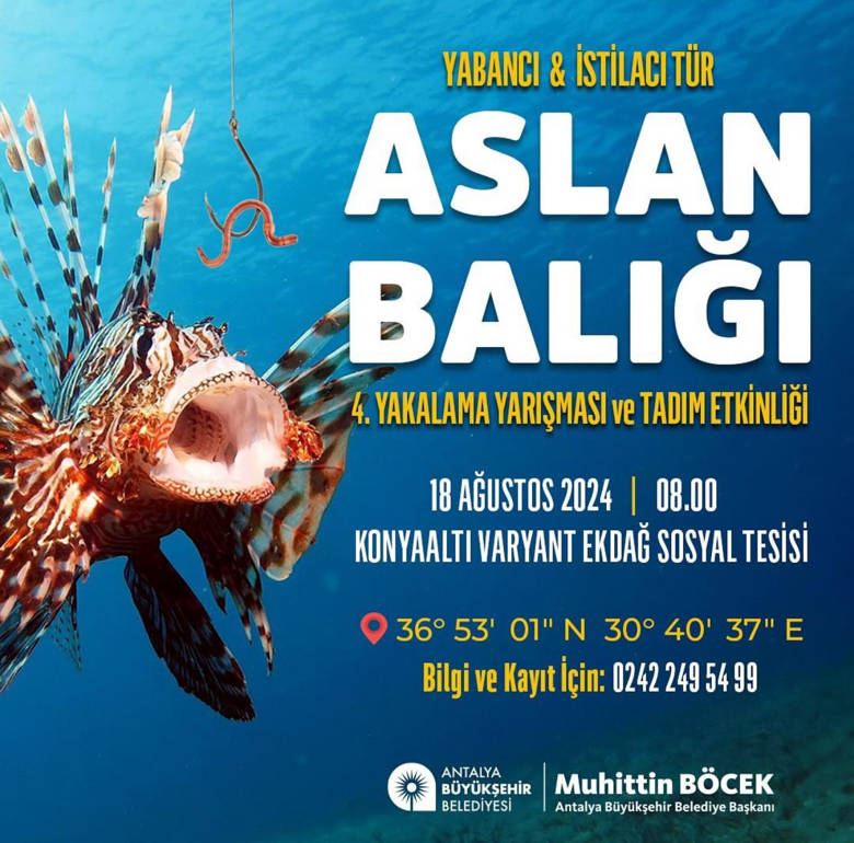 Antalya Büyükşehir Belediyesi Aslan Balığı Yakalama Yarışması ve Tadım Etkinliği düzenliyor.18 Ağustos Pazar günü Konyaaltı…