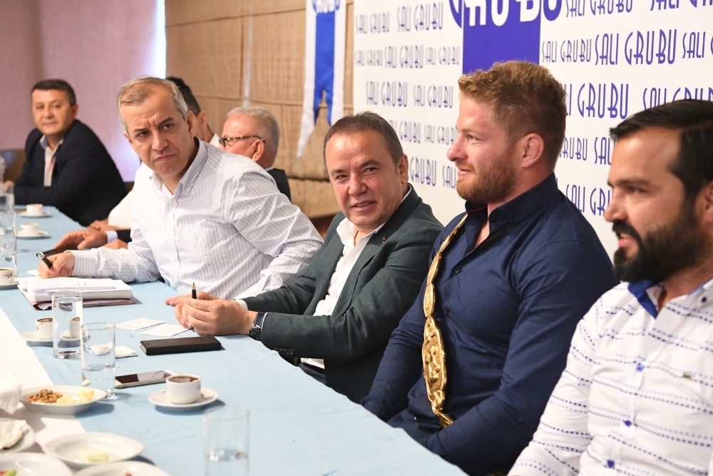 Konyaaltı Belediye Başkanı Muhittin Böcek, 656. Tarihi Kırkpınar Yağlı Güreşleri başpehlivanı İsmail Balaban ile birlikte Salı Grubu Başkanı Muharrem Koç’un başkalığında Antalya Tenis İhtisas Kulübü (ATİK)’nde gerçekleştirilen ‘Ata Sporu Yağlı Güreşleri’ konulu toplantının konuğu oldu. Toplantıya grup üyesi iş insanlarının yanı sıra 656. Tarihi Kırkpınar Yağlı Güreşleri başpehlivanı İsmail Balaban, ikiz kardeşi Turhan Balaban, Konyaaltı Belediyesi Spor Kulübü Güreş Takımı Antrenörü Hasan Aydın ve yardımcı antrenör Ufuk Atalan da katıldı.