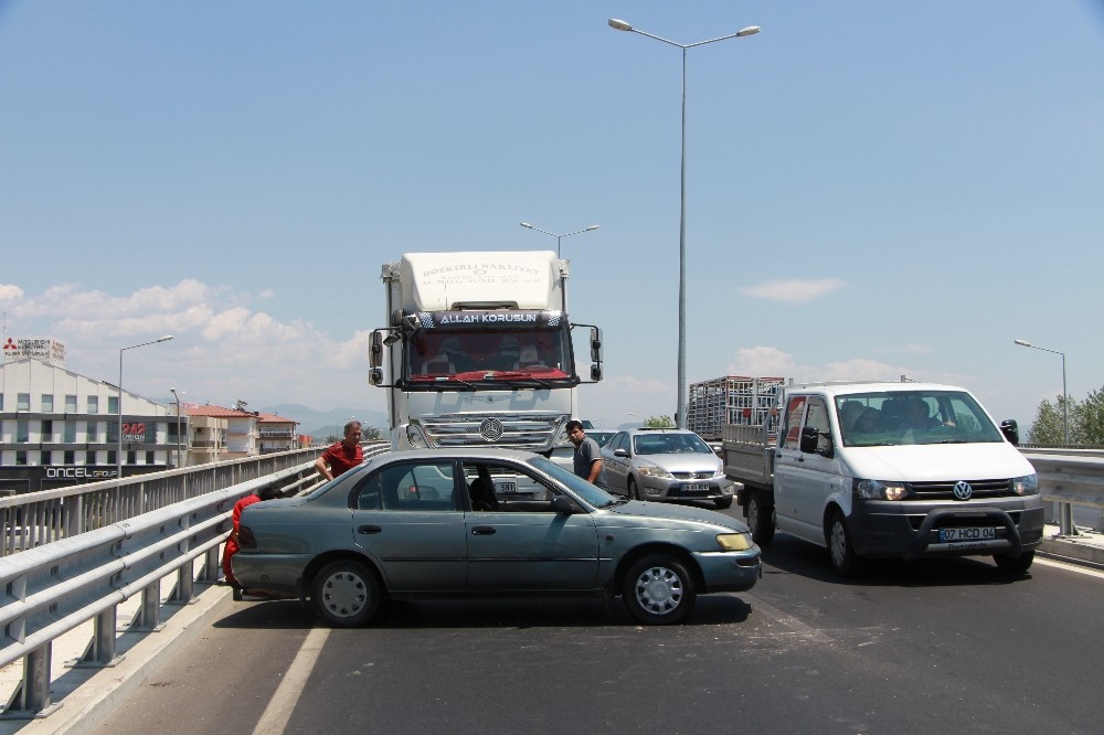 Edinilen bilgiye göre, Antalya istikametine gitmekte olan Mehmet K.’nin kullandığı 42 BK 581 plakalı kamyon, Manavgat Çevreyolu Sanayi Köprülü Kavşağında önünde gitmekte olan İlyas A.’nın kullandığı 70 FR 391 plakalı otomobile çarptı. Çarpmanın şiddetiyle yolda dönen otomobile kamyon bu kez de yan tarafından çarptıktan sonra durabilirken, kazada kimsenin burnu bile kanamadı. Kazanın ardından Köprülü Kavşakta trafik akışı uzun süre tek şeritten sağlanırken uzun araç kuyruğu oluştu. Trafik akışı araçların yoldan kaldırılmasının ardından normale döndü.
