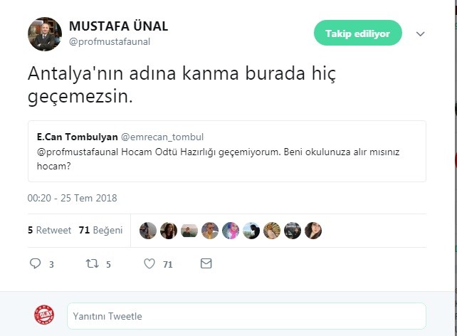 ODTÜ İnşaat Mühendisliği okuyan E. Can Tombulyan, sosyal medya hesabı üzerinden Akdeniz Üniversitesi Rektörü Mustafa Ünal’a mesaj yazarak, kendisini okuluna almasını istedi. Tombulyan yazdığı mesajda, “Hocam ODTÜ hazırlığı geçemiyorum. Beni okulunuza alır mısınız hocam?” dedi. Bunun üzerine öğrenciye aynı şekilde sosyal medya hesabından cevap veren Rektörü Mustafa Ünal, “Antalya’nın adına kanma burada hiç geçemezsin” dedi. Bunun üzerine rektöre bir cevap daha veren öğrenci Tombulyan, “Tamam hocam özür dilerim” diyerek mesajına ağlama simgesi koydu. ODTÜ’lü öğrenci ile Akdeniz Üniversitesi rektörü arasında geçen bu konuşma kısa sürede çok sayıda retweet aldı.